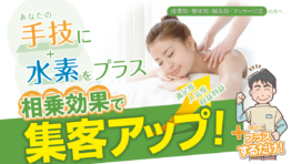 コンテンツあなたの手技に水素をプラス プロの手技による即時効果が高い身体外部からの施術と、水素による体内器官から働きかける抹消血流促進効果や抗酸化作用/抗炎症作用を組み合わせることで、「凝りも」「疲れも」「痛みも」「炎症も」今までの数十倍もの改善効果が期待できます。水素ガス吸入...コンテンツ