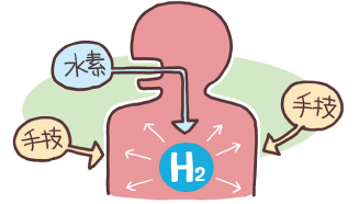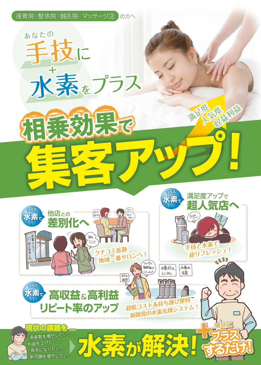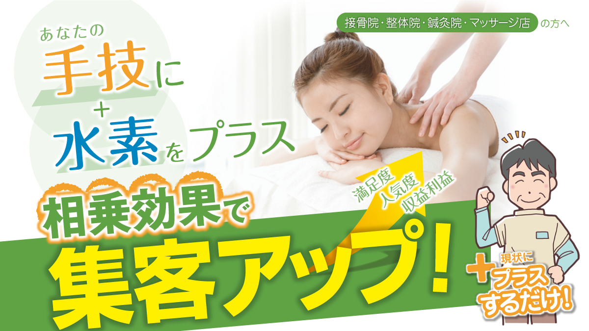 プロの手技による即時効果が高い身体外部からの施術と、水素による体内器官から働きかける抹消血流促進効果や抗酸化作用/抗炎症作用を組み合わせることで、「凝りも」「疲れも」「痛みも」「炎症も」今までの数十倍もの改善効果が期待できます。